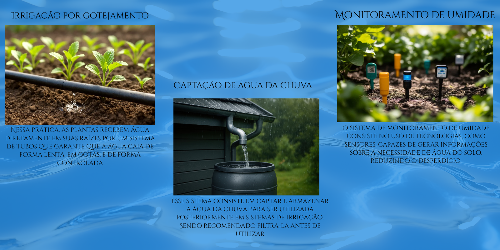 1️⃣ Uso consciente e eficiente da água: A água é um recurso essencial tanto para a agricultura quanto para a manutenção da vida. O uso consciente e eficiente desse recurso na atividade agrícola envolve práticas como a irrigação por gotejamento, reaproveitamento da água da chuva e o monitoramento da umidade do solo. Essas estratégias evitam o desperdício e reduz os custos de produção.