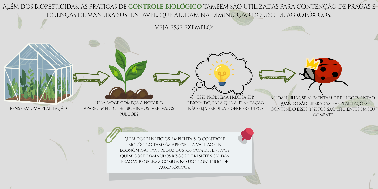 2️⃣ Uso de biopesticidas: Os biopesticidas são produtos de origem natural, obtidos a partir de microrganismos e plantas, utilizados no controle de pragas e doenças. Diferentemente dos agrotóxicos convencionais, esses produtos apresentam menor toxicidade, reduzem a contaminação do solo, da água e dos alimentos, além de causarem menos impactos à saúde humana e à biodiversidade.