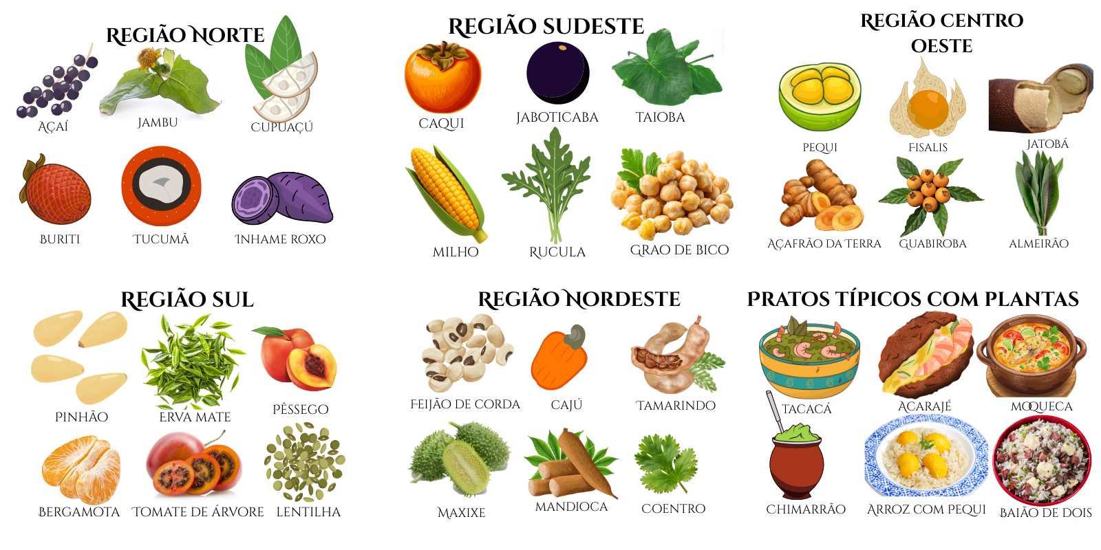 ⤿ Na culinária, as plantas também não ficam de fora. Nas regiões brasileiras, as plantas são ingredientes essenciais dos pratos típicos, como o jambu, o pequi e o açaí. 🍽️🥬