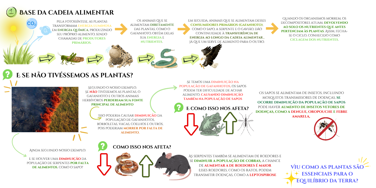 1️⃣🌱 As plantas são produtores primários que produzem seu próprio alimento e isso significa que estão na base da cadeia alimentar, a sustentando. Se as plantas desaparecessem, muitos animais perderiam sua principal fonte de alimento e, consequentemente, outros também seriam afetados. Um exemplo prático: O gafanhoto come grama ➛ O sapo come o gafanhoto ➛ A cobra come o sapo ➛ O gavião come a cobra. Agora, se o gafanhoto não tiver grama para se alimentar, ele pode morrer. E se isso acontecer, o que o sapo irá se alimentar? Sem alimento, o sapo morre, e o que a cobra irá comer?