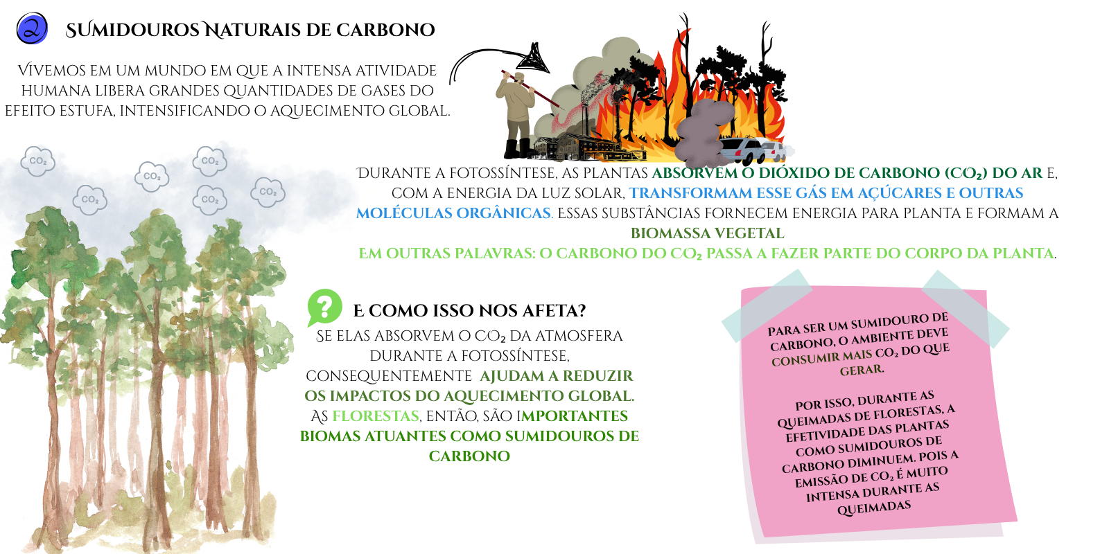 2️⃣🌴 Além disso, as plantas ajudam a equilibrar o clima do planeta. Durante a fotossíntese, elas absorvem o gás carbônico (CO₂) da atmosfera e o transformam em matéria orgânica, armazenando-o em seus tecidos. Esse processo reduz a quantidade de CO₂ no ar, diminuindo os efeitos do aquecimento global e do efeito estufa. Por isso chamamos as plantas de sumidouros naturais de carbono. Assim, as plantas têm um papel essencial na manutenção da vida e na regulação do clima da Terra.